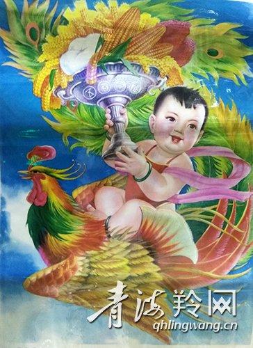 在李俊卿先生收藏的一张上世纪 80 年代的年画上,一个胖乎乎的孩童,脸颊红润,穿着红肚兜,举着一个蔬果托盘,坐在跃起的公鸡背上,整幅画面喜气洋洋,红红火火。李俊卿先生介绍,喜庆的孩童形象是上世纪 70 年代末至 80 年代年画中最常见的形象,是改革开放后民众心情的一种表现。