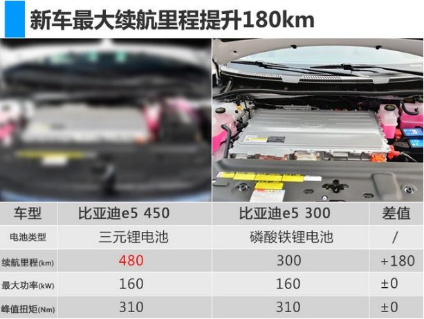 比亚迪e5 450电池组能量密度为140.97Wh/kg,最大充电功率由40kW提升至60kW。搭载的电动机的最大功率为160kW,峰值扭矩为310Nm,等速法纯电动续航里程可以达到480km,综合工况续航提升至400km。