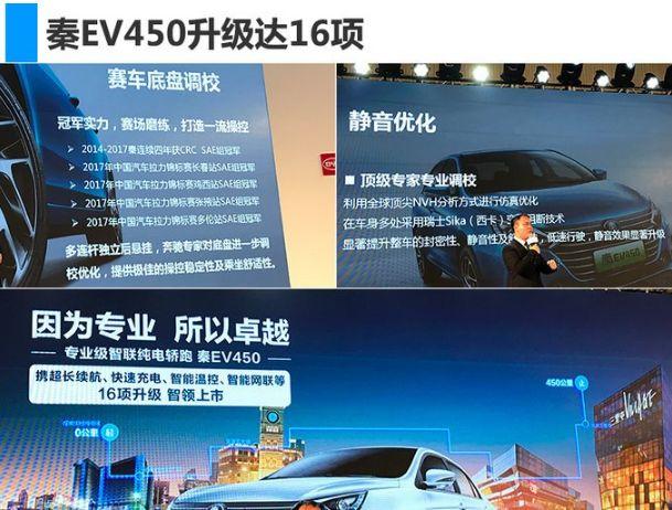 2018年3月31日,比亚迪秦EV450、e5 450以及宋EV400三款纯电动车型正式上市,官方指导价区间分别为24.065万元-26.065万元、22.065万元-23.065万元和26.415万元-27.415万元,补贴后售价区间分别为14.99万元-16.99万元、12.99-13.99万元和18.99万元-19.99万元。三款新车搭载了比亚迪最新的电池智能温控管理系统,且由磷酸铁锂电池升级为三元锂电池,续航里程均有不同程度的增加。新车官方指导价有所调整,其中宋EV400各款车型均降价1750元。