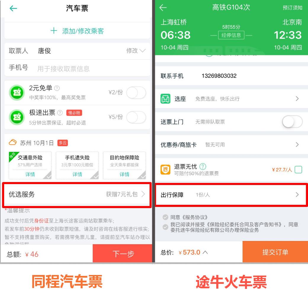 以同程和途牛为例,上图左侧为在同程旅游APP购买汽车票时的界面,右侧为在途牛旅游APP购买高铁票时的界面。同程默认附加了一项优选服务,途牛附加了出行保障,二者直观看上去均没有价格显示,但实际这是两项收费服务,同程的优选服务价格5元,途牛的出行保障价格20元。由于标识不够明显,且需要点击进入才会发现是收费项目,如果用户没有仔细观察的话,很容易在不知情时发生额外消费。