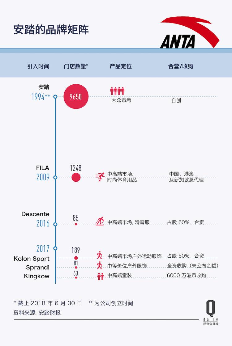 除了 FILA ,安踏手中已经有了一系列海外品牌。它分别和日本品牌迪桑特(Descente)、韩国户外 Kolonsport 的母公司合营着二者在中国区的业务。它还收购了主打健步鞋的 Sprandi 和香港童装小笑牛(Kingkow)。