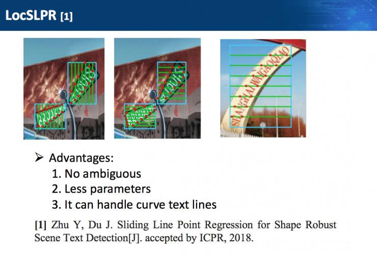 第二个要解决的是多角度问题。对于多角度问题,如果在第一步直接拟合四个顶点会产生歧义,为了避免这种情况,他们在第一步使用了 LocSLPR,会对输入图像构建空间金字塔,在各个尺度上描绘出文本的轮廓,从而完成文本行的准确定位。