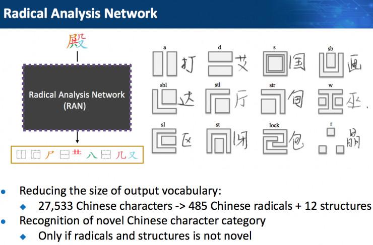 这次比赛 NELSLIP 团队用到 Radical Analysis Network,该网络主要用于解决少样本问题,这一网络基于张建树在 ICME2018 上的论文 Radical analysis network for zero-shot learning in printed Chinese character recognition,在比赛中做了一些优化,有如下明显优点: