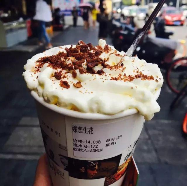而这家蜀色茶颜让人驻足的原因是——颜值真的很高,名字也都充满诗情画意,招牌饮品蝶恋生花,上面是奶、下面是茶,店员介绍说奶油是用的安佳的,奶油上还撒了一层奥利奥粉和干果碎,“外貌控”可能光为了发朋友圈也会去买一杯。