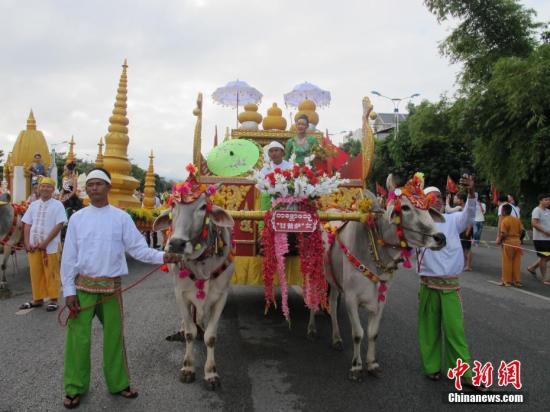 资料图:参加中缅胞波狂欢节巡游的牛车即将上场。中新社记者 陈静 摄