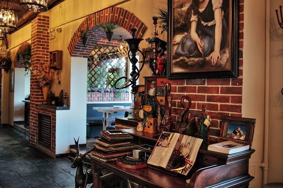 店内装修古朴典雅,红砖拱门,原木吧台经典的欧洲范儿。鹿角麻绳吊灯原始粗犷,水晶鸟笼吊灯彰显低调的奢华。造型独特的酒具和摆件或质朴或华美,充满异域风情。大幅的油画,无论暮霭下的白桦林还是朝霞中的冷杉树还是艳阳高照的雪国,都是从本土背回的画家的心血,笔触间饱含着对格鲁吉亚风光的无限热爱。