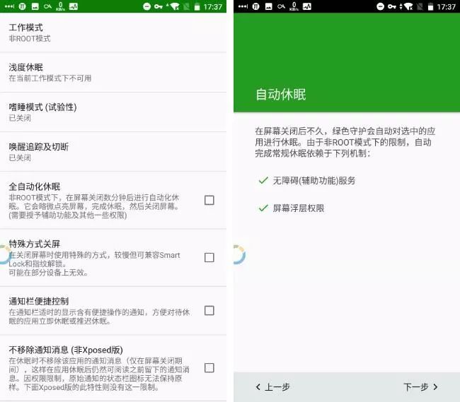 绿色守护 常常被用来管理 Android 后台,而它有三种模式,非 Root、Root、Xposed,其中非 Root 模式是需要开启辅助功能的。绿色守护会在初始化设置时询问你的设备是否 Root?如果你不想 Root 手机或者你的手机由于某些原因不能 Root,那这时就可以选择我的设备未 Root。全自动化休眠会请求进入到设置中的无障碍服务授权。请记得一定要开启辅助功能,否则绿色守护的全自动化休眠功能将无效。