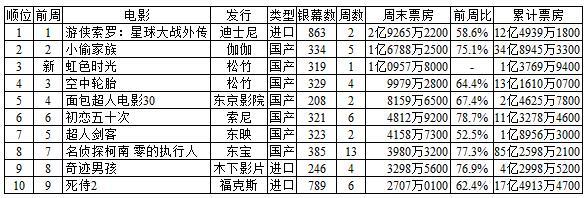 东宝发行的《名侦探柯南 零的执行人》上映第13周8位,上映以来87日间累计观客数652万4006人次,累计票房收入85亿2598万2100日元。连续一个季度13个星期进入榜内了,按说好的附上个名单来。