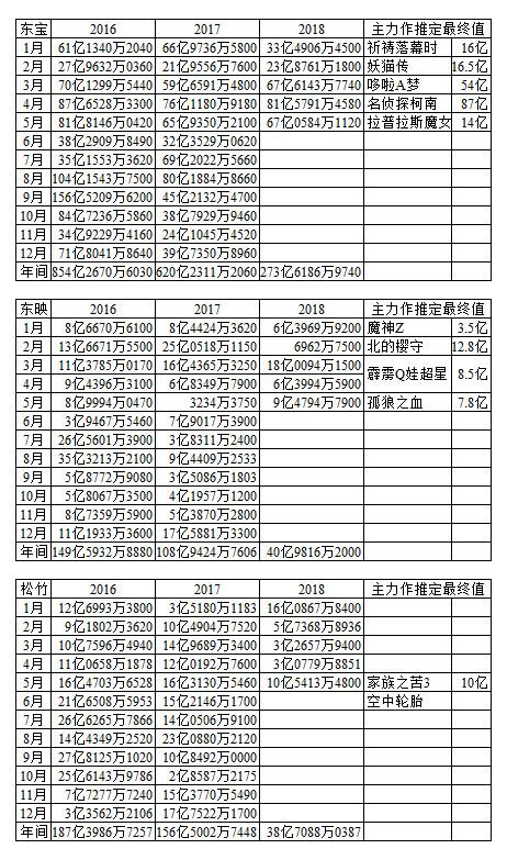 注:最右列推定最终值是未然状态的数字,已然的实绩累计值进展见前表,最终上映结束后的实绩值最晚最晚可能等到翌年3月初统一发布年度决算。电影的票房收入,不是发行公司的营业收入,这类数字见各公司财报;也不是公司发行电影所得的收入,这类数字2000年度起不再公开。