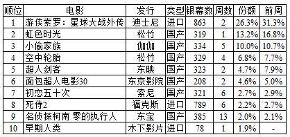 迪士尼发行的《游侠索罗:星球大战外传》连续2周首位,上映以来10日间累计观客数已经突破90万人次。累计票房收入12亿4939万1800日元,最终票房收入预期值维持30亿日元。