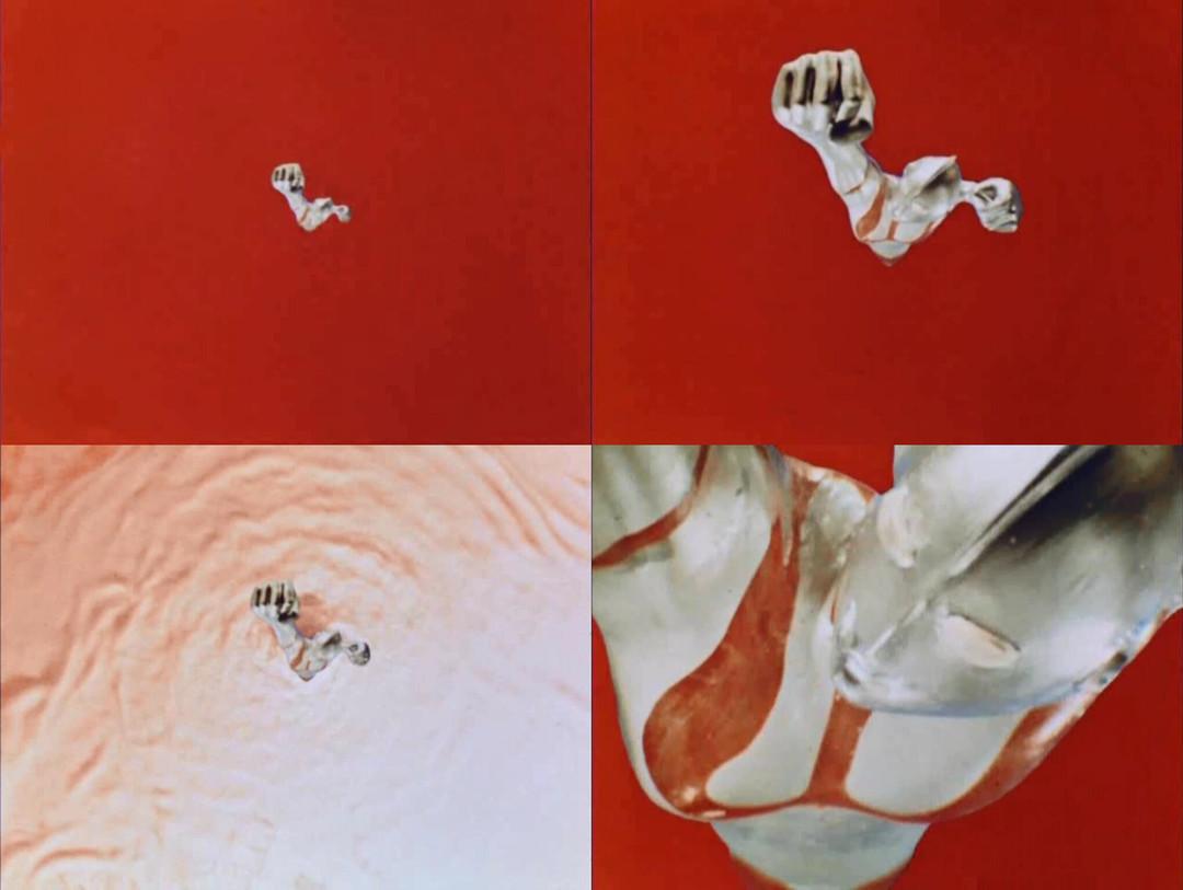 最后还有第四项不能忽略,如果再仔细看动态的影像,从头到尾画面上一直有不停向上升的烟雾状的东西。那玩意儿的正体是干冰,这也是高野的主意。央视版《西游记》的时候用来形成天宫云雾缭绕的视觉形象用的也是干冰,这条大概挺有名了。在镜头上方画面范围外放上装置,让干冰就像瀑布一样倾洒下来,覆盖在镜头前方,因为二氧化碳比空气密度大。但是画面上烟雾状的东西一直是往上升的,这就是逆回转摄影的技法,上回也还刚刚说过,不是单纯的所谓倒放。