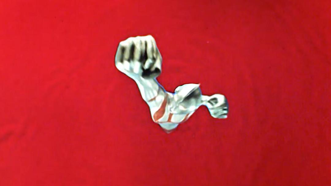 再来说说奥特曼的变身场景兼用卡,这个右拳举高巨大化过程的影像。摄影素材本身知名度已经不小了,是个人偶,造的时候就故意把右拳造得巨大到臃肿的。那摄影方式呢,也同样是爬上吊车,镜头从高空对着下方。不过这回不用完全的90度垂直,摄影的是高野的助手佐川和夫。