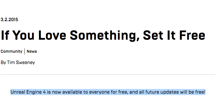 2015 年 3 月 2 日,虚幻引擎 4 完全免费了。Epic Games 放出了百分之百的 C++ 原始代码,虽然独立开发者想要开发 AAA 级别大作还是需要资金,但至少现在他们手上的虚幻引擎 4 和大厂手里的没有任何区别。