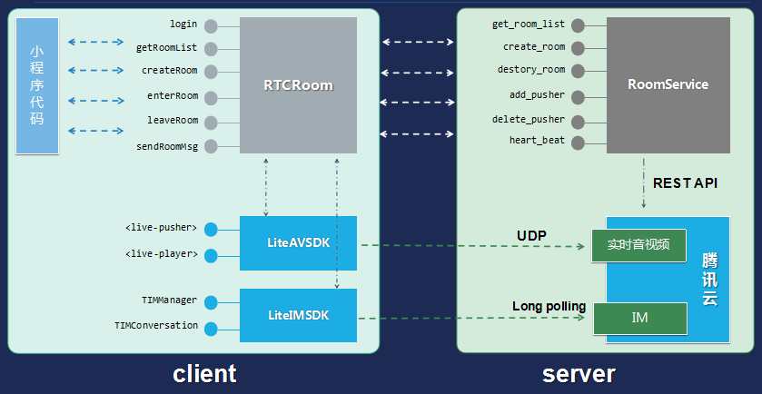 多人通话:双人通话的时候是单对单的传输,但是在多人通话状态时,信息是多对多的传输,这个时候需要一个总控系统,去协调不同端的状态,协调各个端的输出,包括什么时间点谁说话,谁不能说话。腾讯视频云团队,基于小程序自定义组件的设计标准,实现了一套被称作 RTCRoom的解决方案,用于对视频房间进行状态同步和统一管理。