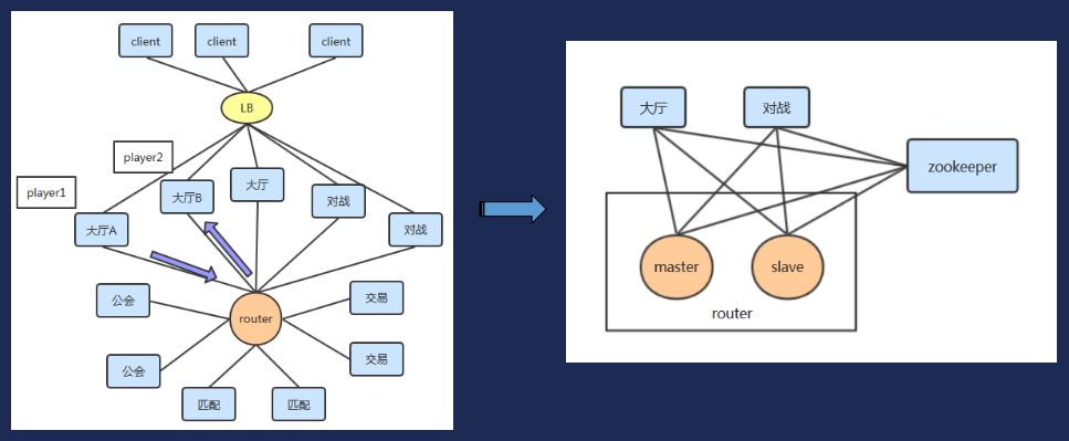 不同节点之间通过 router进行通信,router是实现节点间消息转发的服务器。比如说 A节点中的 Player1对象要向发送 B节点中的 Player2对象发送组队邀请,可以将消息发送到 router,router再转发到 B节点处理之后再发送到 Player2的客户端。在这个结构中,所有的节点都是对等的关系,任何两个节点通过 router都可以实现消息互通。但是这个图有一个明显的题:router是一个单点,有容错性问题和可扩展性问题。对于容错性问题,可以通过引入主备机制来解决,借助 zookeeper可以实现主备的自动切换,当主节点不可用时,自动切换到备节点。