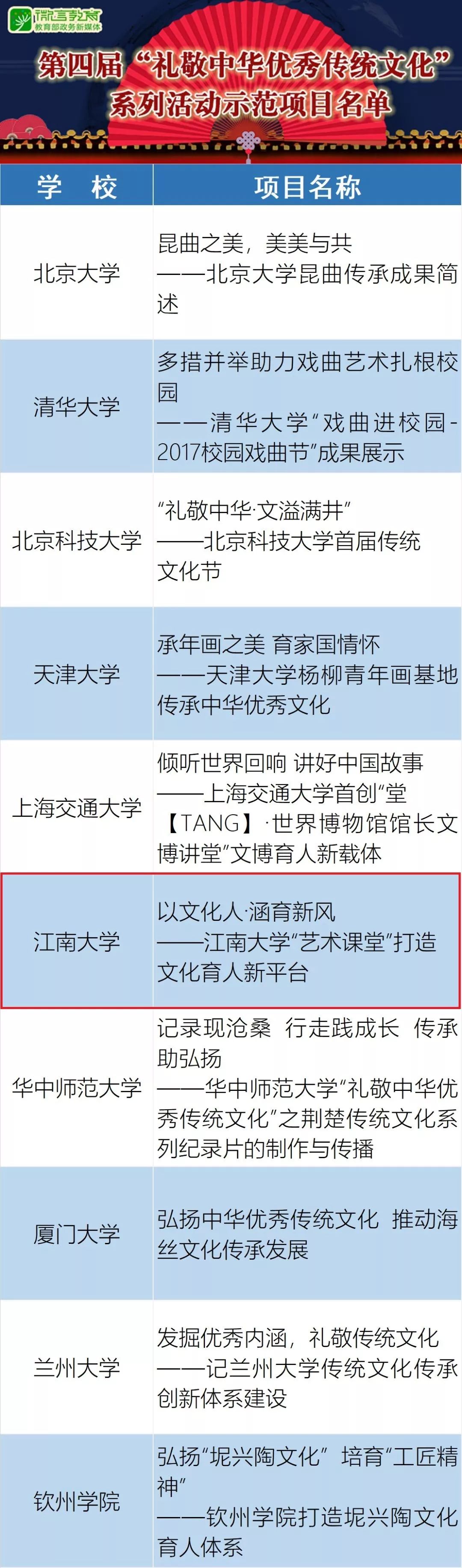 其中江南大学《以文化人·涵育新风——江南大学“艺术课堂”打造文化育人新平台》入选第四届“礼敬中华优秀传统文化”系列活动示范项目。