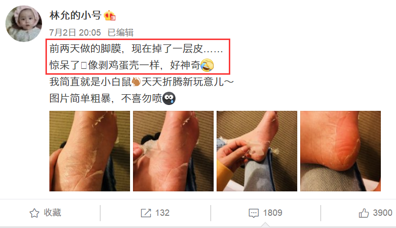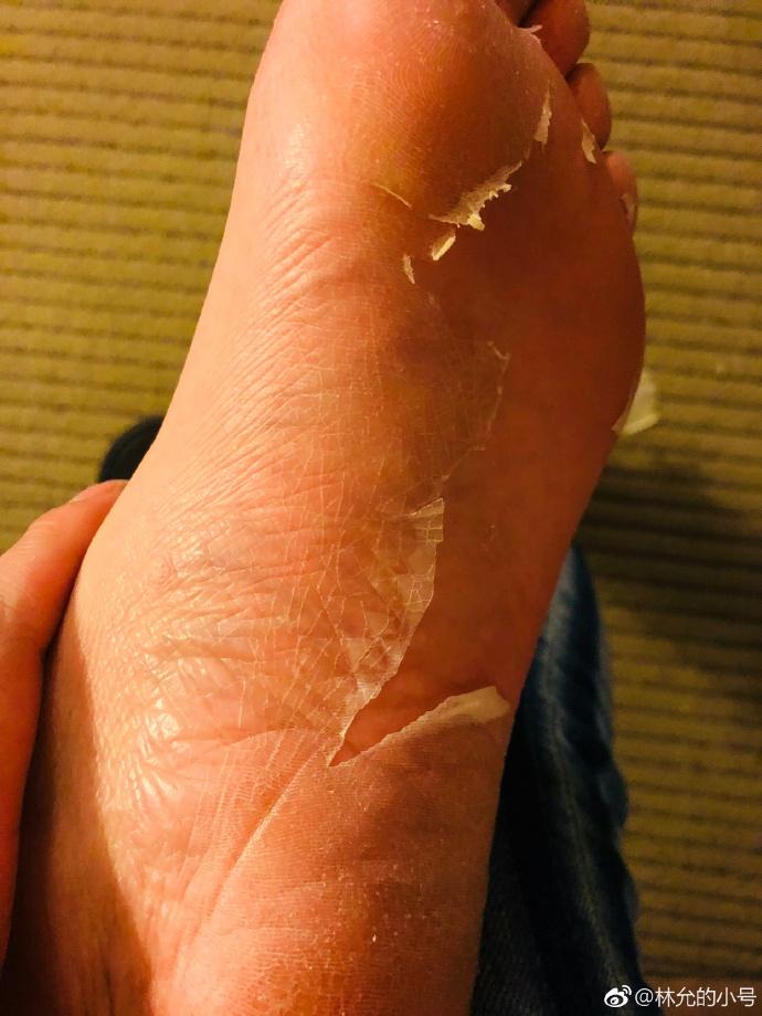 谜底似乎很快就揭晓,除了脸上抹的,其中一样肯定有脚膜。晚上林允坐在一边望着自己的双脚,一边晒出自己的最新成果。她前两天刚刚敷了脚膜,像小白鼠一样在做实验,没想到这么快就起反应了,脚开始脱皮,她忍不住要撕下来。
