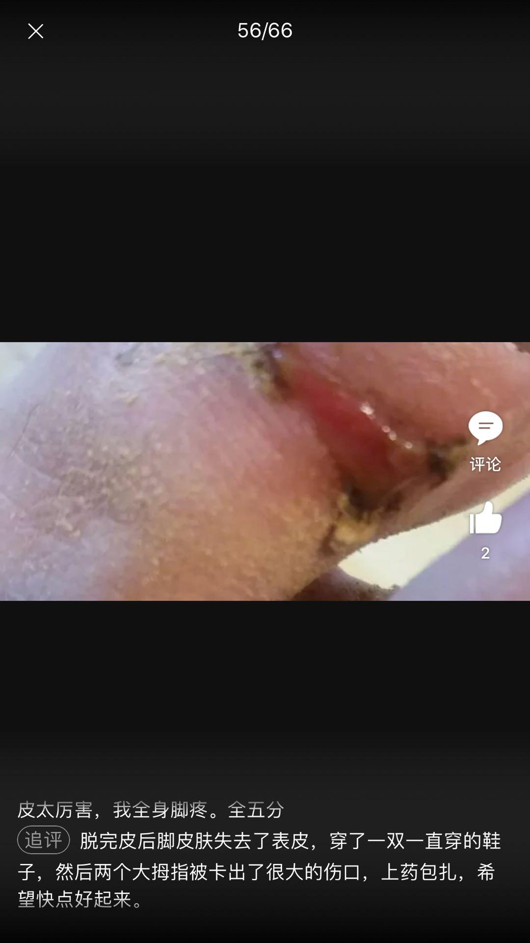 看看她的双脚,这脱皮未免也脱得太吓人了,一大片撕下来,网友们看着都感受到了痛,当然也觉得相当恶心。不知道的还以为她的脚是化妆品过敏,或者光脚踩了雨水被弄烂的。