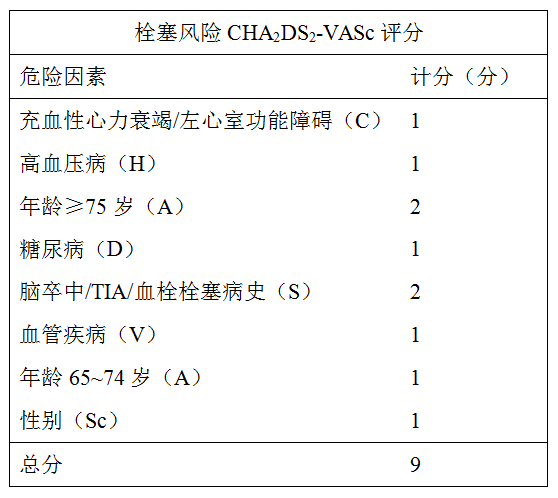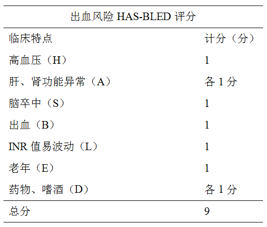 本患者为65岁老年男性,患糖尿病、高血压、冠心病、肾衰竭,栓塞风险CHA2DS2-VASc评分为4分,属于高危,校正的脑卒中年发生率4%;出血风险HAS-BLED评分3分,属于高危。