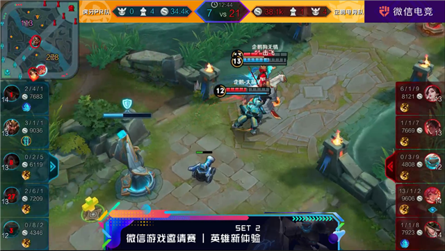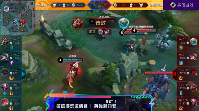 英雄新体验环节,两支战队都要使用“盾山+两个指定英雄+自选英雄”的阵容。英雄新体验第一轮对战双方颇有“默契”的选出了镜像阵容,双方辅助盾山化身“奶塔小天使”,场面一度僵持不下。后期像风的娜可露露抓住机会收走干将莫邪,一波抗塔点水晶。两位解说直呼难分难打的精彩程度不输职业赛事。