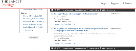 ②Melissa A Merritt and others:《Pre-diagnosis and post-diagnosis use of common analgesics and ovarian cancer prognosis (NHS/NHSII): a cohort study》.The Lancet Oncology,July 17, 2018