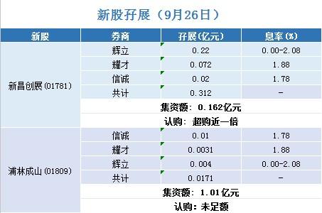 新昌创展(01781)正在招股中,截至9月26日,辉立、耀才、信诚共计为其借出0.312亿孖展金,超购近1倍;为浦林成山(01809)借出0.0171亿孖展金,未足额。