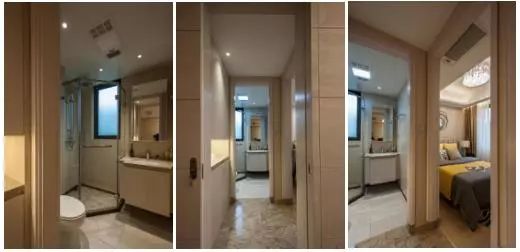 考虑到早晚使用高峰期家庭成员的不同需求,洗手台被外移到走道里。通过精心设计的盥洗空间使洗漱、沐浴等各种活动同时进行时都能得到完美的满足。