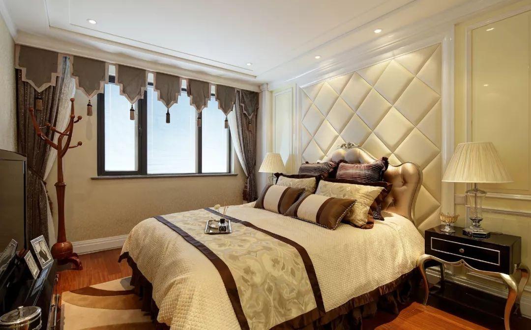 主人房最大的亮点是衣柜门即是电视墙,使衣柜完整如一的同时留出大床的空间。主人房同样采用软包床头,暖色调墙面,圆形倒角天花布局,使整个房间布局统一协调。