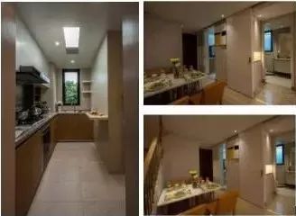 面向餐厅的厨房门采用外推拉门,可将推拉门隐藏到入户门后,打开时高效地节省了平开门可能占用的空间,关闭时又不影响厨房的正常使用。厨房尽量采用沿墙全周布局,尽可能延伸组合柜台的工作面,同时把最需要自然采光的洗碗池放置在窗边,使整个空间高效便捷。同时通过预留了双开门冰箱的位置,洗碗池和洗碗机一体设计等,让科技带来的高品质生活成为可能。整体橱柜采用原木色底柜配合白瓷色上柜,使厨房空间温馨且干净整洁。