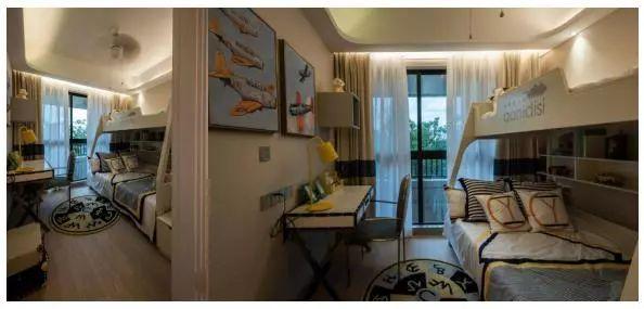 儿童房是最为不确定的功能性房间,高低床的使用让这种不确定性彻底被规避。倒圆角天花和柔和的局部灯带,配以风扇天花灯,让整个空间充满趣味感,柔美而童真。圆形的地毯,童趣的壁画,素色的窗帘,使儿童房活泼热闹的同时不失干净整洁。