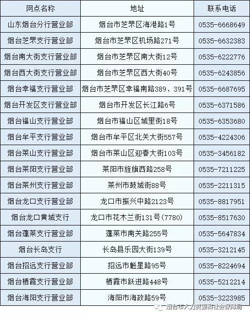 (1)市直:烟台市人力资源和社会保障信息中心(烟台市社会保障卡服务中心),莱山区府后路2号(人力资源市场三楼86、87号)6202923