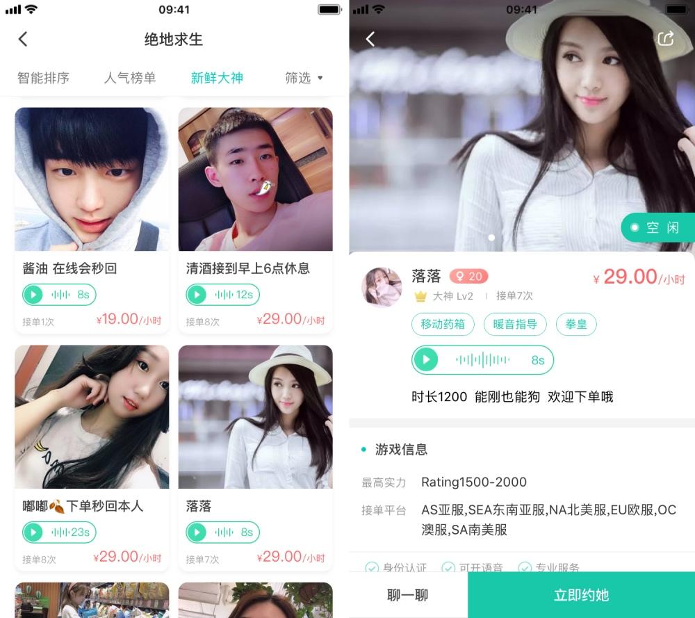 在这个功能下,玩家因为需求的不同被分为了两种,一种是有技术大神,一种是技术不过关但愿意「给钱求带」的小白。「陪玩功能」就是让这两种玩家沟通和联系的地方。