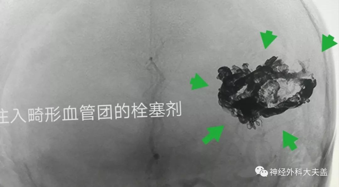 畸形团内注入的栓塞剂清晰可见(下图)