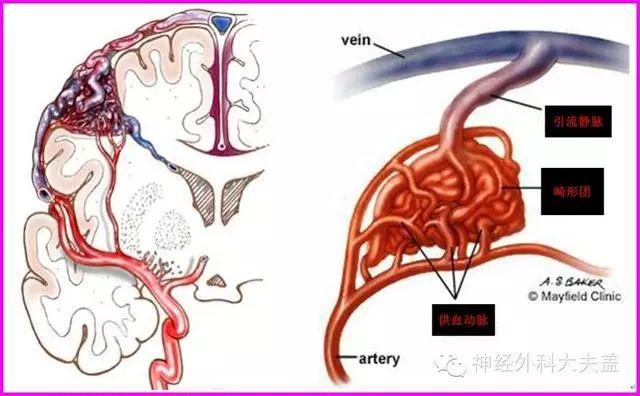 是一种先天性颅内血管畸形,是脑内动脉和静脉间的结构发育异常,导致二者之间正常的毛细血管网被“线团样”血管巢所取代,由于这些“线团样”血管巢内血管管壁菲薄,相互之间沟通很多,导致血流大量从巢内经过冲击血管壁时管壁破裂导致脑出血,一旦破裂造成颅内出血会导致生命危险。