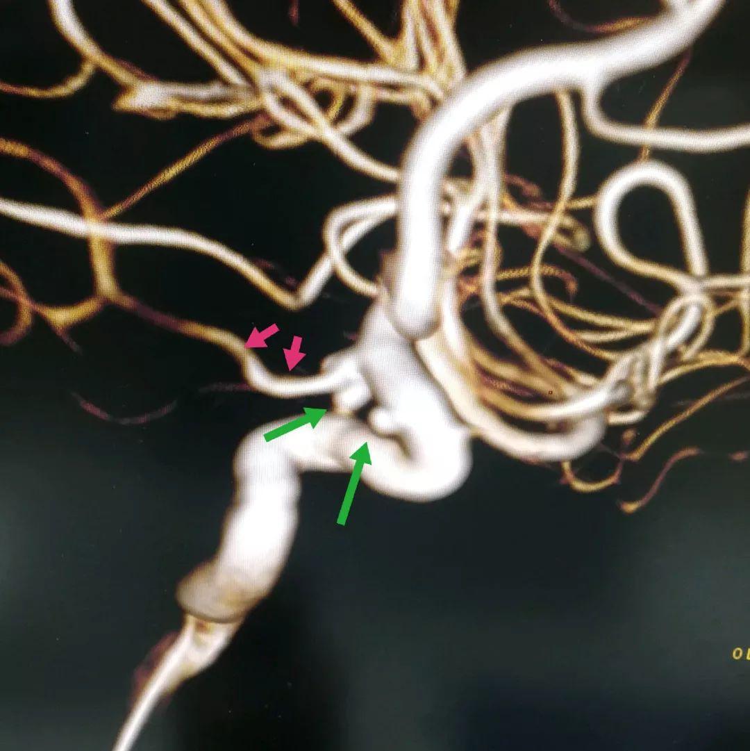 患者中年女性,头痛头晕检查发现颅内多发动脉瘤(下图绿箭头),一个位于后交通段,一个位于眼动脉段。