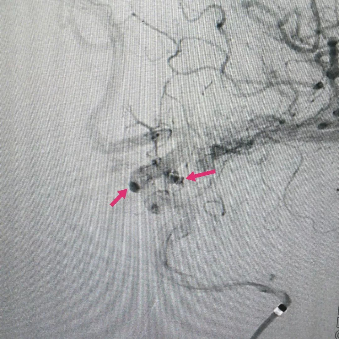 而且在较大的动脉瘤腔还长出了一根重要动脉血管-后交通动脉(红箭头),该动脉一旦闭塞可能会导致偏瘫甚至昏迷不醒