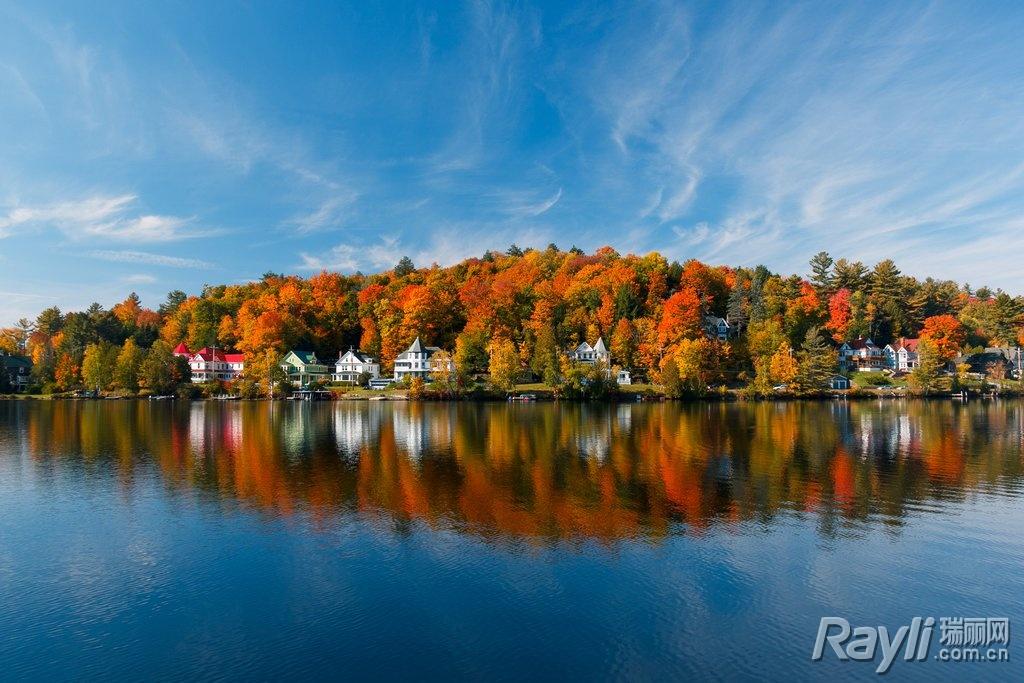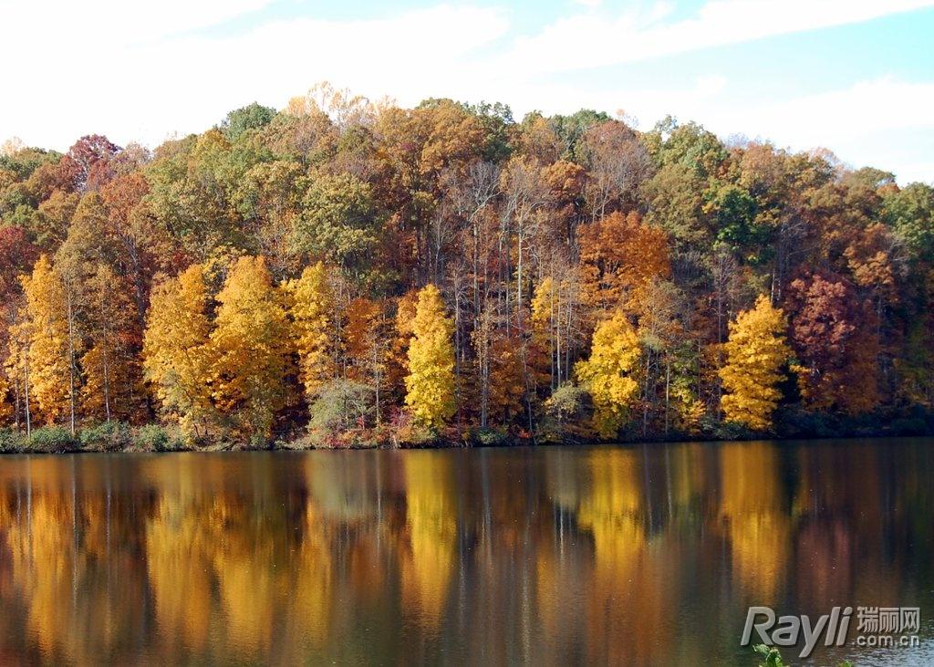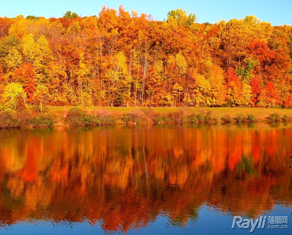 特别是在秋日,湖水一改往日严肃深沉的碧蓝,贪心地把所有红氤氤金灿灿的树叶倒影,收进潋滟的柔光里。