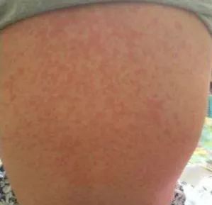 从出皮疹开始3~4天为出疹期,其皮疹的出现有明显的顺序,即自耳后发际开始——逐渐至额面部和颈部——自上而下蔓延至躯干——然后达四肢——最后到手掌和足底;皮疹为稀疏的、大小无规律的淡红色斑丘疹,疹间皮肤正常 (此点可以与猩红热鉴别);此期全身中毒症状加重,仍有高热甚至体温更高 (这是不同于幼儿急疹的),咳嗽加剧;并出现全身淋巴结、肝、脾可轻度肿大,亦可出现各种并发症如肺炎等。
