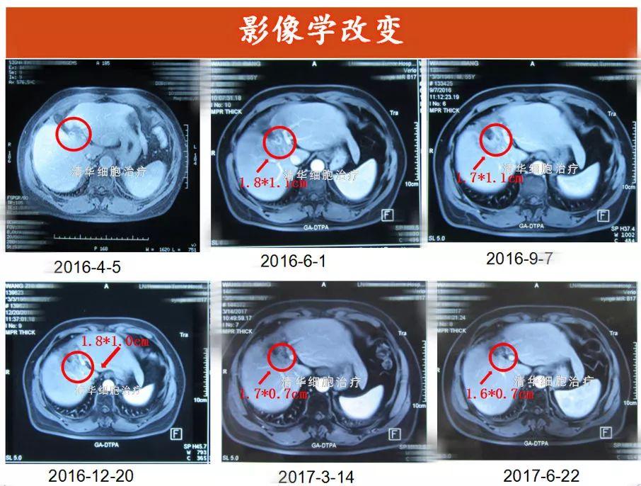 2016年4月,采用NKT细胞免疫治疗,初始治疗方案为1疗程/月,6月改为加强方案治疗,9月改为4+4方案治疗,至今已完成18个疗程(截止2017年7月)。