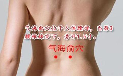 14、气海俞 位于第3腰椎棘突下,旁开1.5寸。现代常用于治疗腰骶神经根炎、腰肌劳损、下肢瘫痪、痛经、性功能障碍等病证