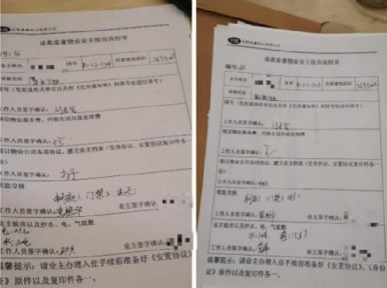 吴鹏向记者解释,门牌号是派出所来贴,水表是建设单位负责安装,物业管理只负责公共区域的管理,仅仅代收水费。而小区住户都是门窗紧闭,物管无法检查每户人家的水表是否一一对应在他看来,如果水表有异常,业主是能够发现的。2015年交房时,他们曾发过接房流程单,在“业主验房以及抄水、电、气底数”一栏,业主和工作人员都签了字。同年2月,因小区业主反映水表自转,他们还张贴过通知,请住户检查水表是否有异常。但根据物管中心的报修记录,两家人都没有来报告过问题。
