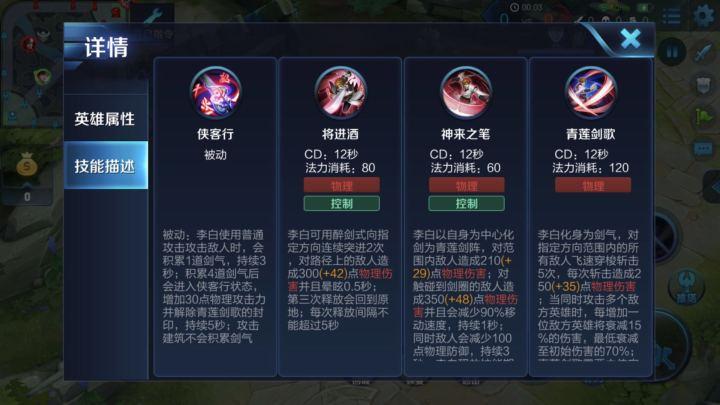 3、一技能前期的CD非常长,主加该技能可以减少CD,增加李白的灵活性,在面对一些前期强势的打野时,主加一技能。