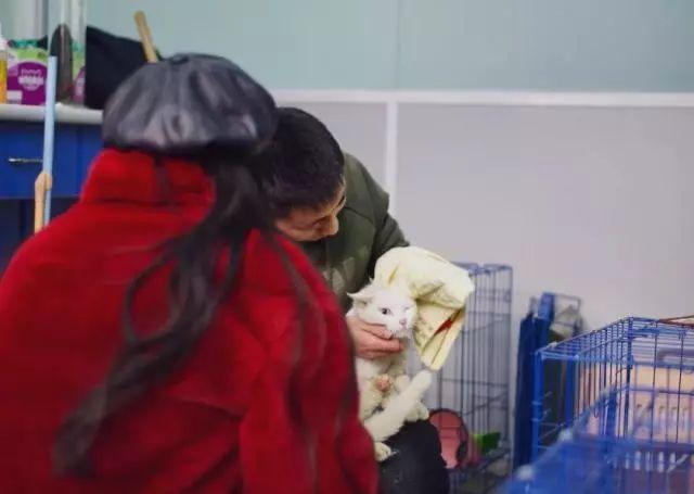 黄锡正在为即将被领养的白猫“洗脸”。