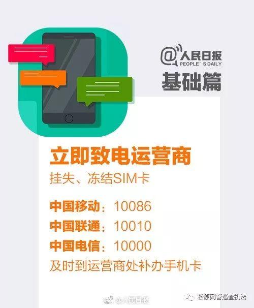 致电手机运营商挂失手机号;②致电银行挂失银行卡;③手机绑定支付宝的,拨打95188挂失;④微信用户登录110.qq.com冻结账号;⑤向派出所申报丢失补领身份证;⑥到手机运营商处补手机卡。转发提醒!
