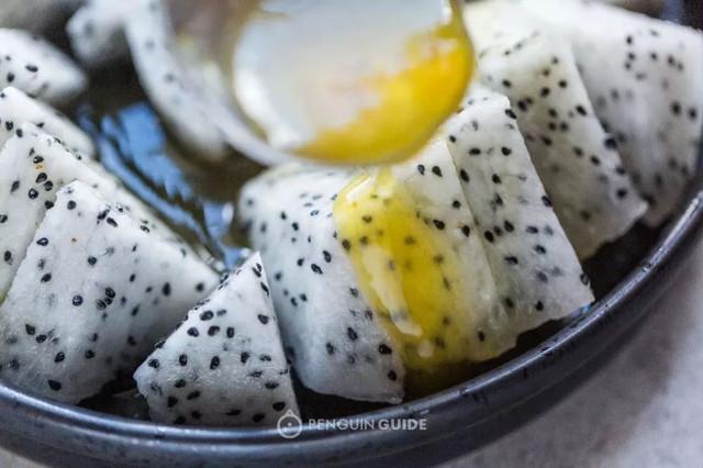 那么冰好,切块,浇上甘草梅汁,神反转来得如此简单。卤汁的酸甜咸,增添层次感,把平平无奇的火龙果点化得特别有趣!