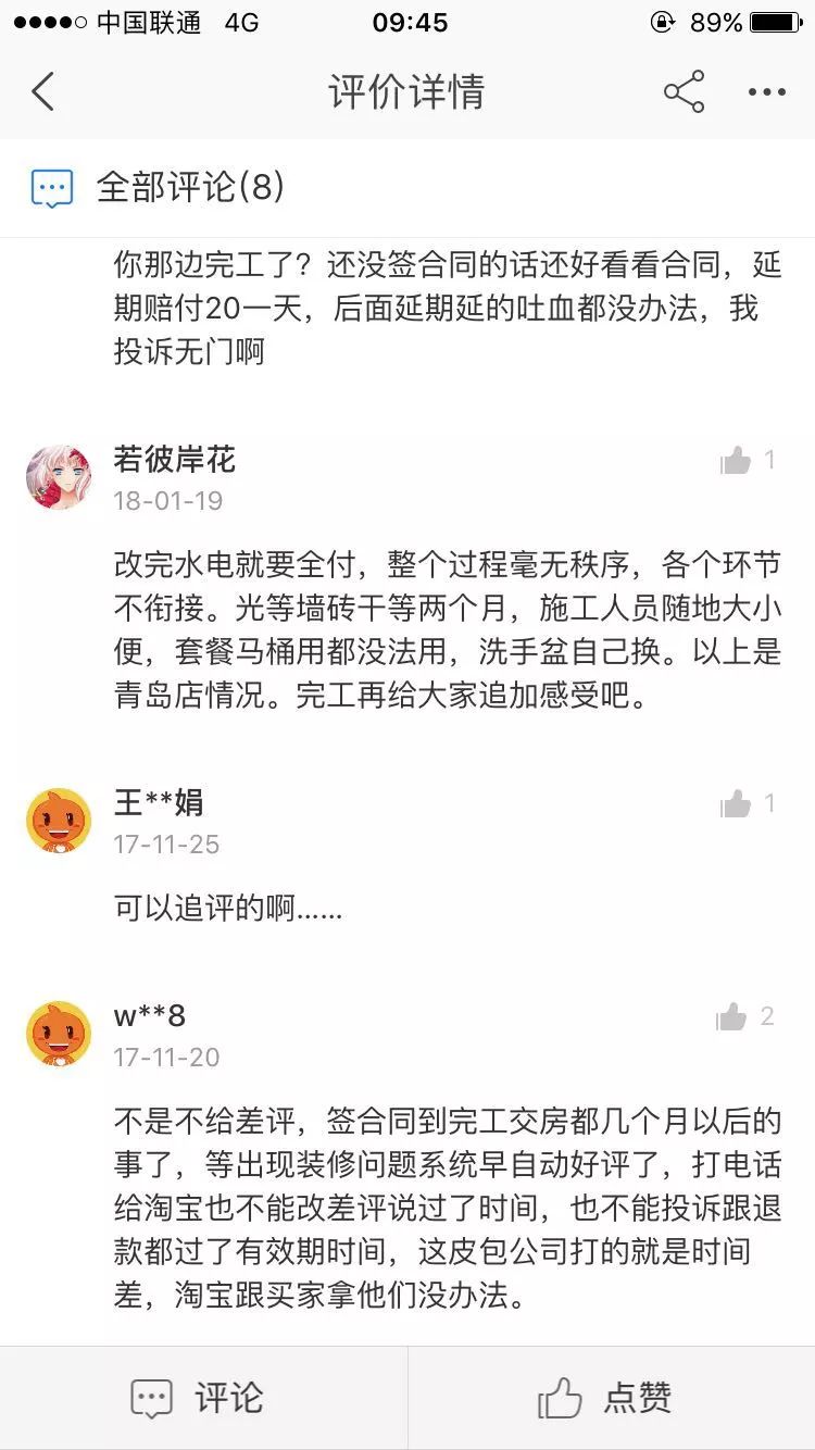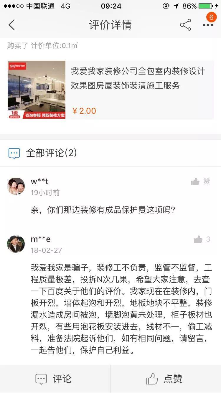 在我爱我家网天猫旗舰店中,有20多位消费者在评价中说自家装修不仅质量达不到标准,还普遍存在工程逾期的情况。装修耗时过长等出现问题时已经过了退款或给差评的时限,因此导致消费者向天猫平台维权也举步维艰。对此,天猫家装回应称在整个服务质保期内,商家提供的相关服务及售后保障如果未按时效进行,天猫将对消费者发起主动赔付并对商家追责。天猫家装相关负责人凯嗣:“针对消费者投诉情况,天猫将对商家采取扣罚款、店铺平台监管甚至关店等处罚等措施。同时,对于严重侵权行为,天猫将情况反馈到相关执法部门,积极配合,保障消费者权益”。