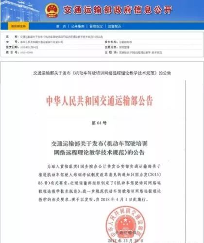 根据《国务院办公厅转发公安部交通运输部关于推进机动车驾驶人培训考试制度改革意见的通知》(国办发〔2015〕88号),交通运输部组织制定了《机动车驾驶培训网络远程理论教学技术规范》于2017年12月15日公开发布,主要是规范机动车驾驶培训网络远程理论教学的教学素材、教学课程(件)以及远程教育平台功能、技术要求、运营服务、课程(课件)质量与服务评价等要求;主要适用于机动车驾驶培训网络远程教育平台的建设、运营和管理,以及指导远程教育平台内教学课程(课件)的制作与管理;是进一步提升驾驶培训行业理论教学质量,满足学员多样化的学驾需求的便民措施。