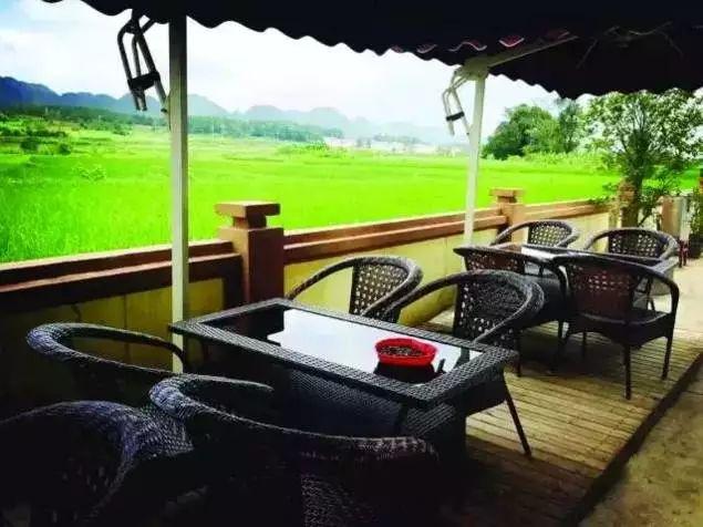 但走进来就不一样了。略带小资风格的长廊和桌椅就摆设在稻田旁边。这个季节过去玩,还能闻着油菜花香,看远处错落有致的布依人家……