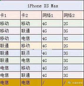 由于国内有2种2G网络、3种3G网络以及2种4G网络,所以iPhone使用三家运营商的任意两种SIM卡的话有多种组合方式,从上图来看,移动+联通、联通+电信、移动+电信、联通+联通组合没什么问题,还可以实现4G+3G组合,不过移动+移动、联通+移动、电信+移动就只有4G+2G,电信+电信则无信号。
