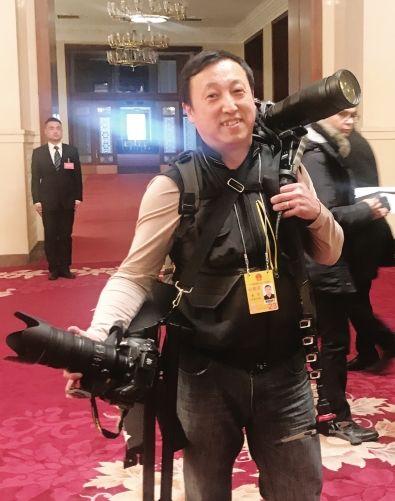 上文中许多照片都出自戴军之手,他虽然是上会记者中年纪最大的,却是最有活力的一个,登梯子爬高都不在话下。一场记者会大概1至2个小时,各路记者挤在会场,没有座位的时候站着听会都觉得很辛苦,但是戴军还要扛着几十斤重的机器站在梯子上拍摄,从头到尾,毫无怨言。